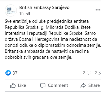 Na Facebook nalogu britanske ambasade ističe se da “sve eratičnije odluke predsjednika entiteta Republika Srpska Milorada Dodika štete interesima i reputaciji Republike Srpske i da samo država Bosna i Hercegovina ima nadležnost da donosi odluke o diplomatskim odnosima zemlje”.