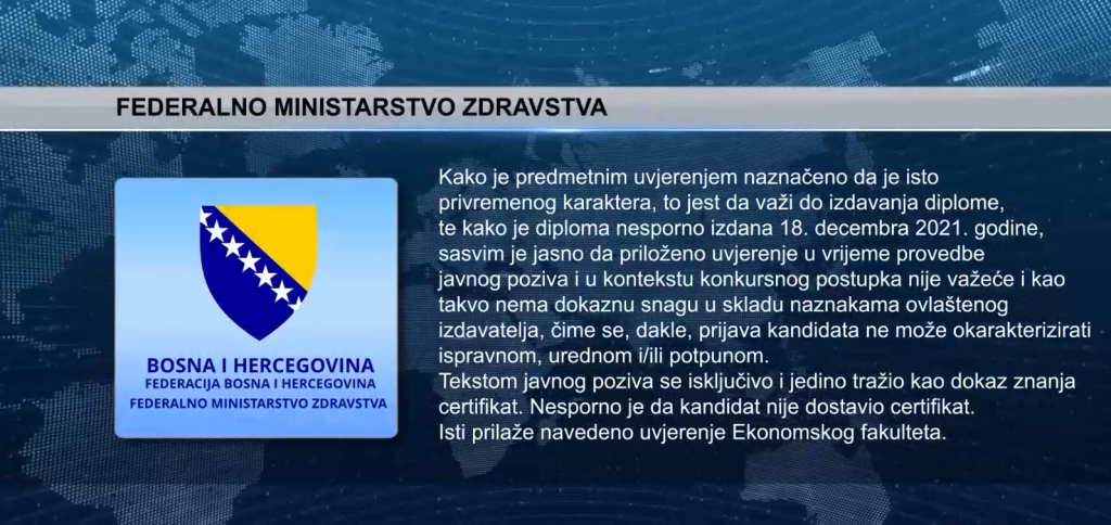 Federalno ministarstvo zdravstva nije dalo saglasnost na imenovanje Ismeta Gavrankapetanovića na mjesto generalnog direktora Klinčkog centra Univerziteta u Sarajevu. Ministarstvo smatra kako se prijava sa priloženim uvjerenjem doktora Gavrankapetanovića ne može smatrati ispravnom.