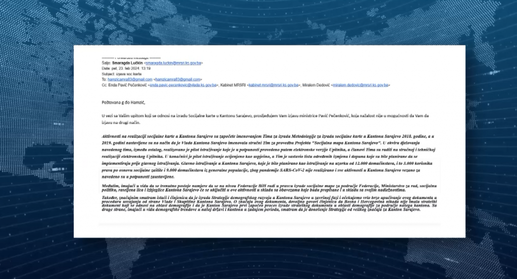 Metodologija izrade socijalne karte u KS usvojena je još 2018. godine. Imenovan je tim za njenu izradu. Više od 65. 000 maraka potrošeno na honorare za eksperte, urađen pilot i sve je stalo prije glavnog istraživanja. Pravdano je to pandemijom. Ni skoro godinu dana poslije, pomaka nema. U odgovoru koji smo dobili iz nadležnog ministarstva, očigledno se odustalo od ovog projekta.