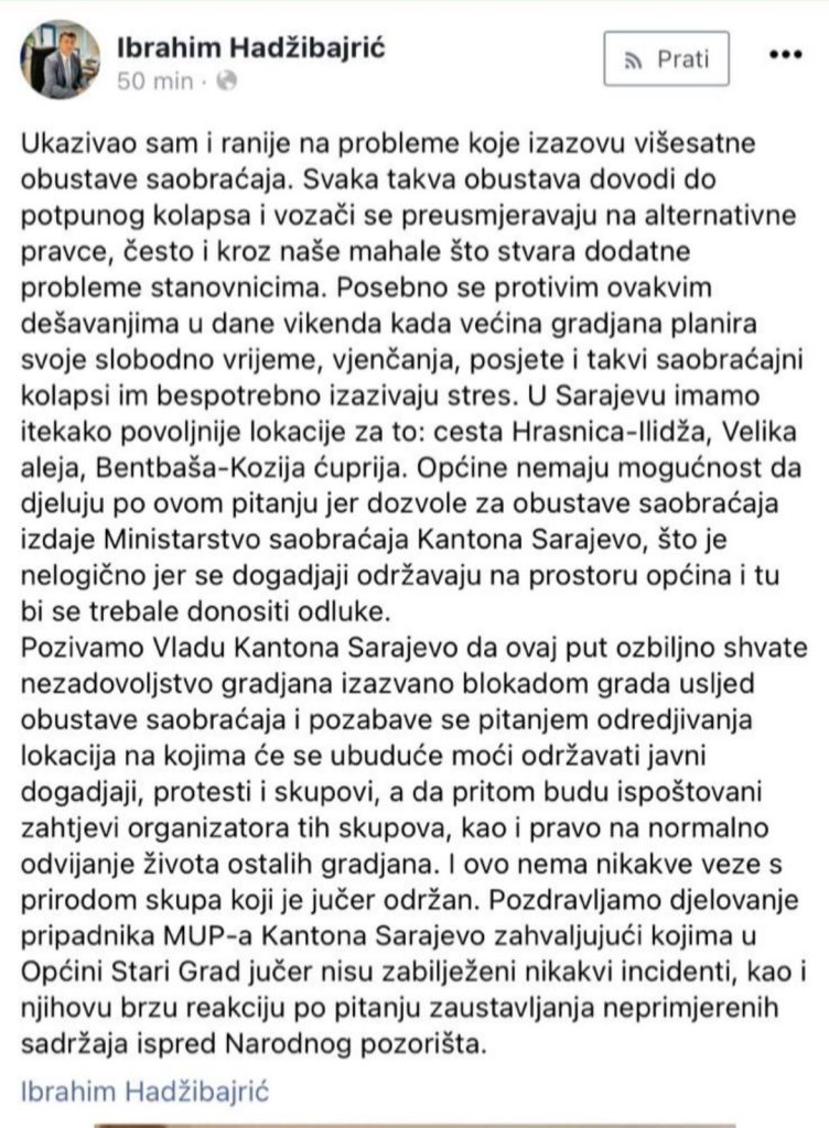 Na zvaničnoj Facebook stranici, Ibrahim Hadžibajrić, načelnik Općine Stari grad, pozvao je Vladu Kantona Sarajevo da ovaj put ozbiljno shvate nezadovoljstvo gradjana izazvano blokadom grada usljed obustave saobraćaja i da se pozabave pitanjem odredjivanja lokacija na kojima će se ubuduće moći održavati javni dogadjaji, protesti i skupovi.