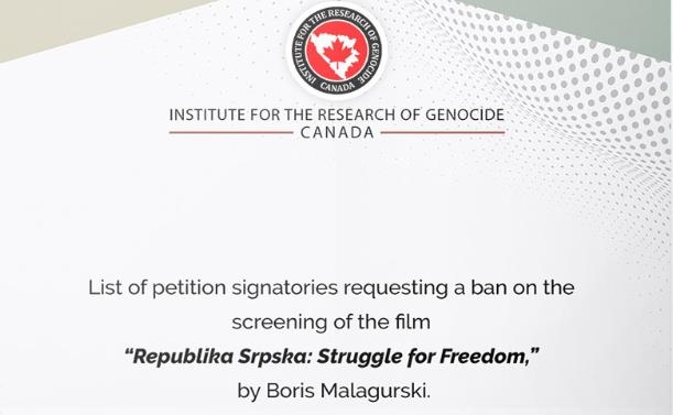 Institut za istraživanje genocida Kanada (IGK) je poslao peticiju za hitno zaustavljanje promocije filma o bosanskohercegovačkom entitetu Republika Srpska s više od 27.000 potpisnika gradonačelnicima svih gradova u kojima je najavljena projekcija filma, premijerima i predsjednicima država tih gradova, bitnim političkim, akademskim i kulturnim subjektima Kanade, SAD i Evropske unije (EU).
