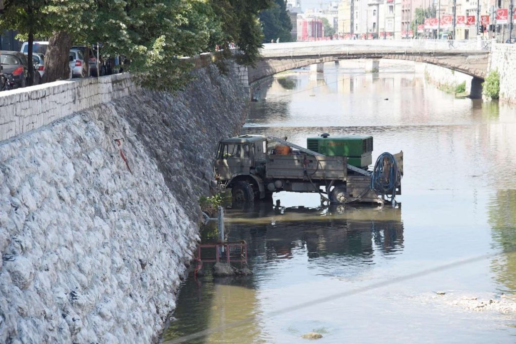 Trenutno se vrši čišćenje zidova korita Miljacke metodom pjeskarenja na potezu od Šeher – Ćehajine do Latinske ćuprije.