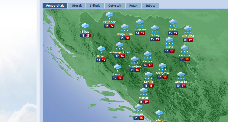 Sutra se očekuje pretežno oblačno vrijeme. Povremeno kiša ili lokalni pljuskovi su mogući u dijelovima centralne i istočne Bosne. Tokom dana, postepen prestanak padavina. Jutarnja temperatura od 12 do 17, na jugu do 20, a najviša dnevna od 14 do 20, na jugu do 24 stepena, podaci su Federalnog hidrometeorološkog zavoda BiH (FHMZBiH).