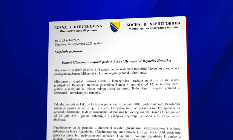 “Ministarstvo vanjskih poslova Bosne i Hercegovine izražava najoštrije osude izjave predsjednika Republike Hrvatske Zorana Milanovića, od 12. septembra 2022. godine, a u kojima je, tokom radnog ručka na samitu Brdo – Brijuni, negirao genocid u Srebrenici”, navedeno je u demaršu.