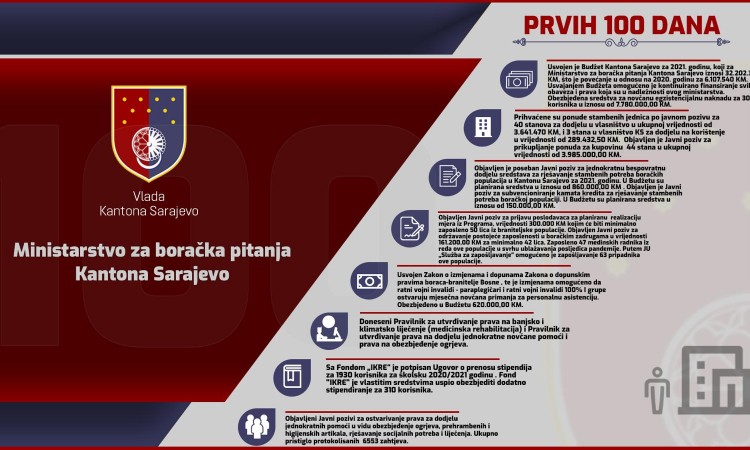 Prvi dani funkcionisanja Ministarstva za boračka pitanja Kantona Sarajevo u aktuelnom sazivu Vlade KS obilježeni su utvrđivanjem pozicije tog ministarstva u budžetu u iznosu od 32.202.359 KM, što je predstavljalo povećanje u odnosu na 2020. godinu za 6.107.540 KM.