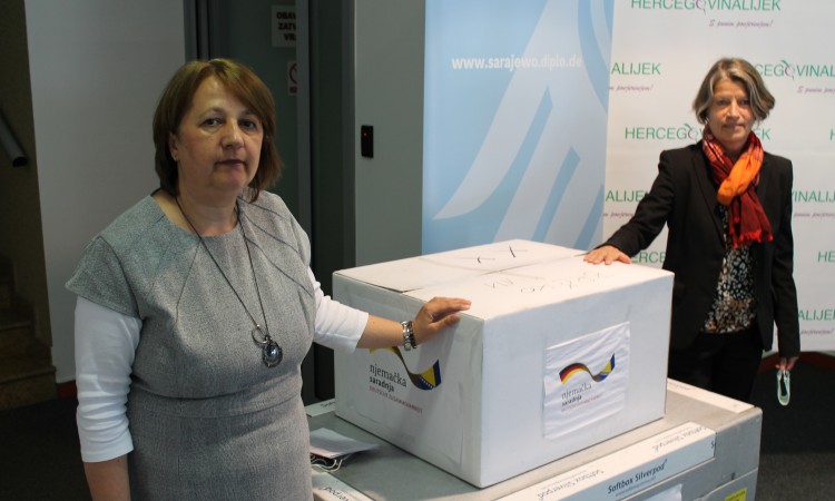 Zamjenica ambasadorice Savezne Republike Njemačke u Bosni i Hercegovini Petra Kochendörfer predala je ovu donaciju Snježani Brčkalo iz Sektora za zdravstvo Ministarstva civilnih poslova BiH.