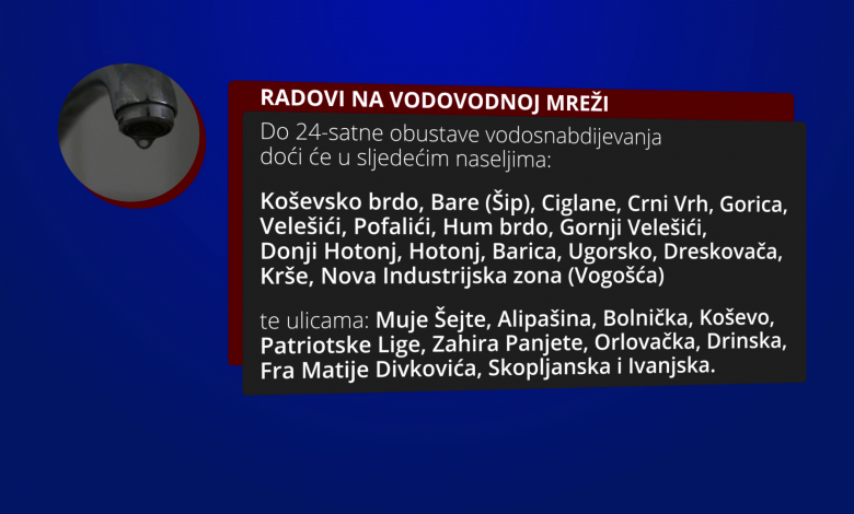 U Pumpnoj stanici „Alipašin most“ počeli su radovi na zamjeni hidromašinske opreme, što je dio projekta obnove vodovodne mreže koji se finansira iz kredita EBRD-a. Zbog toga će doći do 24-satne obustave vodosnabdijevanja u velikom broju naselja. Normalizacija se očekuje po okončanju radova. Iz Vodovoda mole potrošače za razumijevanje.