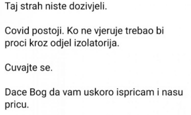 Taj strah niste doživjeli. Covid postoji. Ko ne vjeruje trebao bi proći kroz odjel izolatorija. Čuvajte se. Daće Bog da Vam ispričam i našu priču. Hvala na podršci, lijepim riječima, snazi. Uzdam se u Boga da ćemo pobijediti. Lavovska borba traje.