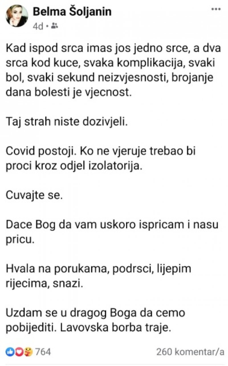 Taj strah niste doživjeli. Covid postoji. Ko ne vjeruje trebao bi proći kroz odjel izolatorija. Čuvajte se. Daće Bog da Vam ispričam i našu priču. Hvala na podršci, lijepim riječima, snazi. Uzdam se u Boga da ćemo pobijediti. Lavovska borba traje.