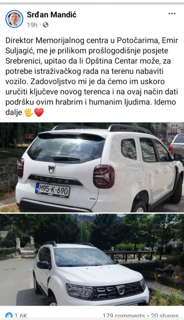 Općina Centar nabavila je vozilo za potrebe istraživačkog rada na terenu Memorijalnog centra u Potočarima, poručio je načelnik općine Centar, Srđan Mandić.