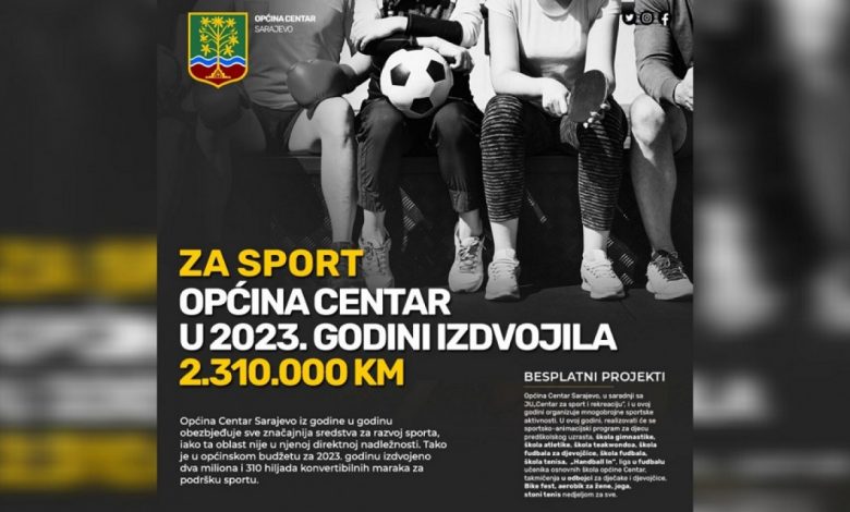 Izdvojeno je i 315.000 KM za sportske projekte za djecu, mlade i ostale građane sa područja općine Centar. U nastojanjima da se stanovnicima centralne gradske općine omogući učešće u što raznovrsnijim sportskim aktivnostima, Općina Centar Sarajevo, u saradnji sa Javnom ustanovom „Centar za sport i rekreaciju“, i u ovoj godini organizuje mnogobrojne sportske aktivnosti. U ovoj godini, realizovati će se sportsko-animacijski program za djecu predškolskog uzrasta, škola gimnastike, škola atletike, škola teakwondoa, škola fudbala za djevojčice, škola fudbala, škola tenisa,  „Handball In“, liga u fudbalu učenika osnovnih škola općine Centar, takmičenja u odbojci za dječake i djevojčice, Bike fest, aerobik za žene, joga, stoni tenis nedjeljom za sve.