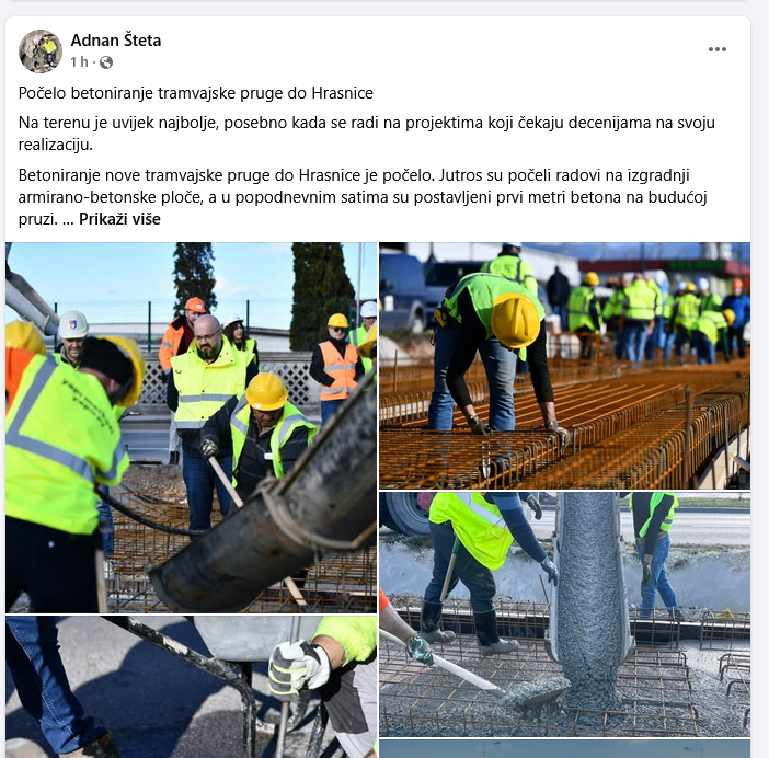 Ministar saobraćaja Kantona Sarajevo Adnan Šteta objavio je na društvenim mrežama da je počelo betoniranje tramvajske pruge od Ilidže do Hrasnice.