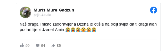 – Naš draga i nikad zaboravljena Džena je otišla na bolji svijet, da ti dragi Allah podari lijepi dženet. Amin – napisao je otac Muris.