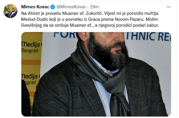 -“Vijest mi je potvrdio muftija Mevlud Dudić koji je u povratku iz Graca prema Novom Pazaru. Molim Svevišnjeg da se smiluje Muamer ef., a njegovoj porodici podari sabur”, saopćio je Kovač.