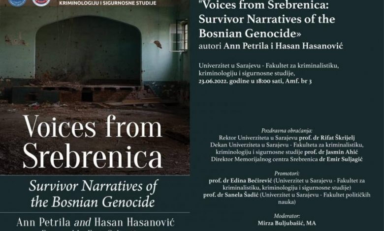 Na Fakultetu za kriminalistiku, kriminologiju i sigurnosne studije u četvrtak 23. juna 2022. godine sa početkom u 18:00 sati održaće se promocija knjige „Voices from Srebrenica: Survivor Narratives of the Bosnian Genocide“ autora Ann Petrila i Hasana Hasanovića.