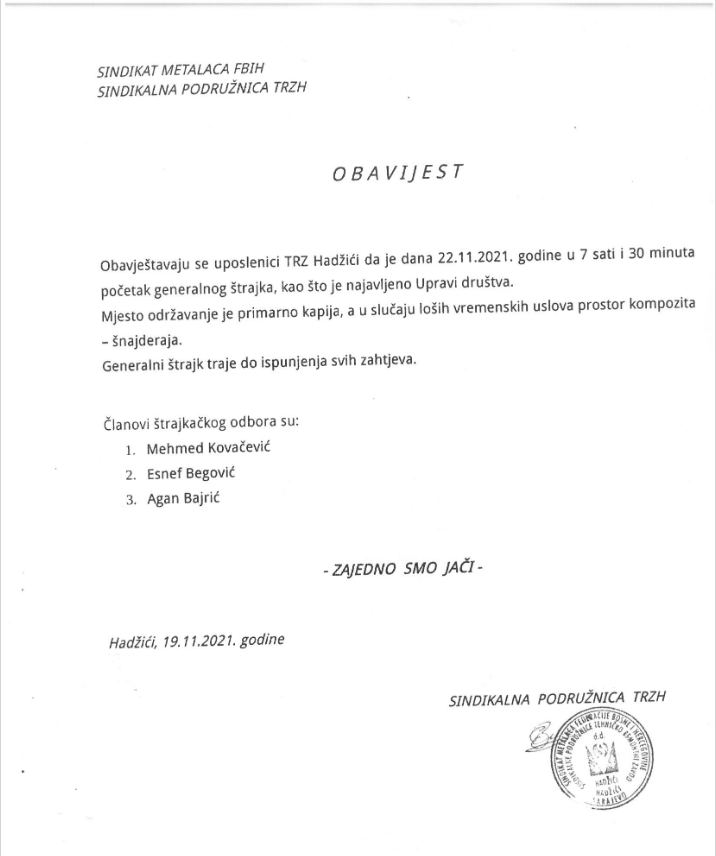Radnicima TRZ Hadžići dd nisu isplaćene 8 plata iz 2016. godine, i tri zadnje plate u ovoj godini sa doprinosima. Uprava odbija da primijeni odrednice Kolektivnog ugovora metalaca u kojima je povećana cijena rada na 3,5 KM. Zadnje dvije godine Uprava ne obezbjeđuje ugovore kojima bi se vršila isplata plata. Firma se zadužuje i dovodi u bezizlaznu situaciju. Štrajk je organizovan do ispunjenja zahtjeva, naveli su u saopćenju.