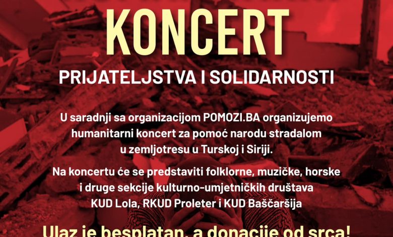 Sarajevska kulturno-umjetnička društva Lola, Proleter i Baščaršija u saradnji sa humanitarnom organizacijom Pomozi.ba 15. marta u Domu mladih u Sarajevu, glavnom gradu Bosne i Hercegovine, organizuju humanitarni koncert prijateljstva i solidarnosti za pomoć ljudima u Turkiye i Siriji, koji su preživjeli katastrofalne zemljotrese, javlja Anadolija.