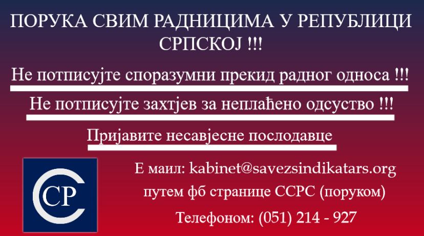 Insistiraju i zahtijevaju od Vlade RS-a da nijedan oblik najavljene pomoći poslodavcima u vrijeme pandemije virusa korona i proglašenja vanredne situacije ne smije biti dodijeljen onim nesavjesnim koji su otpustili radnike.