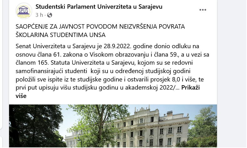 Istovremeno, oglasili su se i iz Studentskog parlamenta, podsjećaju da je Senat Univerziteta u Sarajevu je 28.9.2022. godine donio odluku na osnovu člana 61. zakona o Visokom obrazovanju i člana 59., a u vezi sa članom 165. Statuta Univerziteta u Sarajevu, kojom su se redovni samofinansirajući studenti koji su u određenoj studijskoj godini položili sve ispite iz te studijske godine i ostvarili prosjek 8,0 i više, te prvi put upisuju višu studijsku godinu u akademskoj 2022/2023. oslobodili troškova školarine.