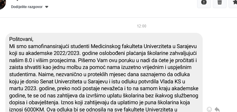 Naime, nezvanično u proteklih mjesec dana saznajemo da odluka koju je donio Senat Univerziteta u Sarajevu i istu odluku potvrdila Vlada KS u martu 2023. godine, preko noći postaje nevažeća i to na samom kraju akademske godine, te se od nas zahtijeva da izvršimo uplatu školarina bez ikakvog službenog dopisa i obavještenja. Iznos koji zahtijevaju da uplatimo je puna školarina koja iznosi 6000KM. Ova odluka bi se odnosila na sve fakultete Univerziteta u Sarajevu. Ovo je zaista urgencija, jer apsolventi UNSA neće moći diplomirati u roku od mjesec dana kada bi to po planu trebali uraditi, a studenti nižih godina neće moći pristupiti ispitima. Mi Vas molimo, da prije svega shvatite u kakvoj smo situaciji, te da Vi kao mediji u ime studenata saznate i obavijestite nas i javnost ko su osobe koje stoje iza ovih neosnovanih naredbi. Zahtjevamo od Vlade KS i Senata UNSA da u roku od sedam dana organizuju hitan sastanak na kojem će biti nađeno rješenje za studente. U prilogu Vam šaljemo dopis Senata UNSA kojim su nas obavijestili u septembru 2022. godine da smo oslobođeni plaćanja školarine.