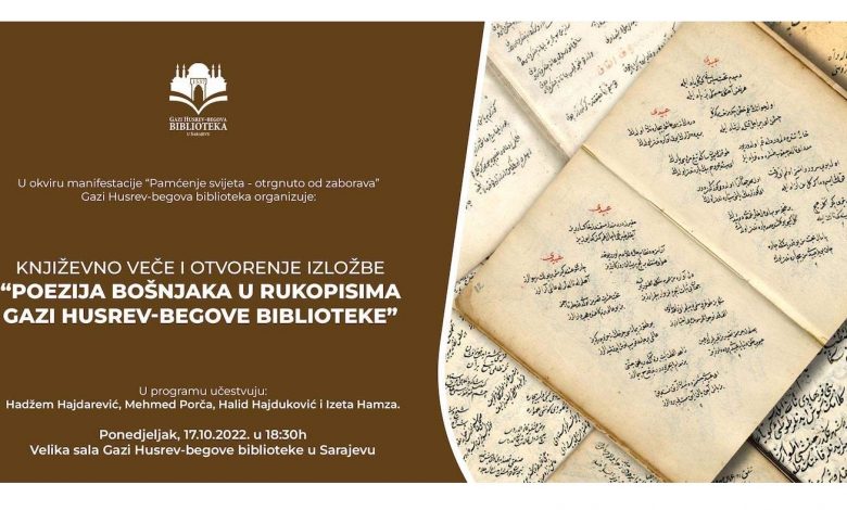 Otvorenje Manifestacije biće upriličeno 17. oktobra 2022. godine, u 18:30 sati u Gazi Husrev-begovoj biblioteci, kada će biti održana književna večer i izložba pod nazivom „Poezija Bošnjaka u rukopisima Gazi Husrev-begove biblioteke“. Učesnici su: književnik Hadžem Hajdarević, glumac Mehmed Porča i muzičari Halid Hajduković (klavir) i Izeta Hamza (violina).