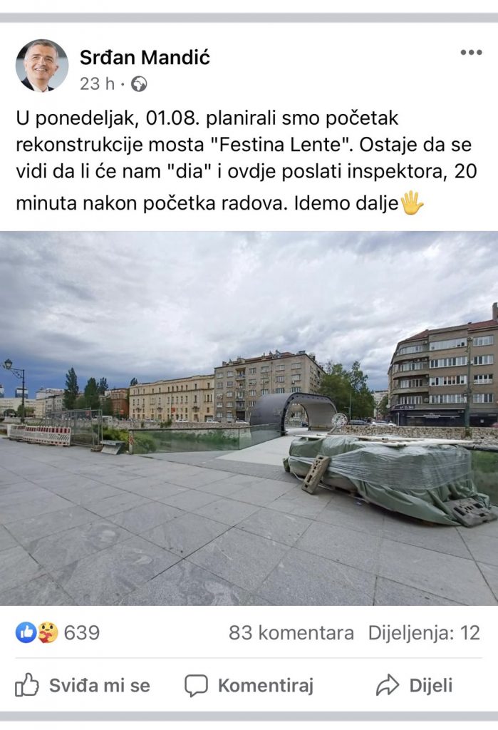 Srđan Mandić, načelnik Opštine Centar, na svom zvaničnom Facebook profilu podijelio je vijest o planiranom početku rekonstrukcije mosta “Festina Lente”.