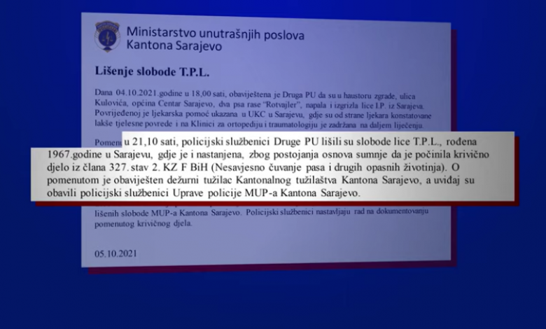 Sve se desilo jučer na ovom mjestu u kasnim poslijepodnevnim satima. U Kulovića ulici na broju 11 u centru grada. U haustoru ove zgrade dva psa rase rotvajler napala su i izgrizla osobu inicijala I.P. nanijevši joj tjelesne povrede. O ovom događaju obaviještena je Druga PU. Povrijeđenoj je ljekarska pomoć ukazana u UKC u Sarajevu, gdje su konstatirane lakše tjelesne povrede i na Klinici za ortopediju i traumatologiju je zadržana na daljnjem liječenju.