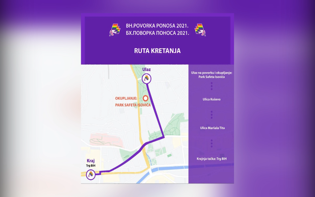 Okupljanje učesnika povorke je u 12 sati u parku Safeta Isovića, zatim će proći kroz Koševsku i Ulicu Maršala Tita, a krajnja tačka bit će Trg BiH. Slogan je „Otpor s margine“.