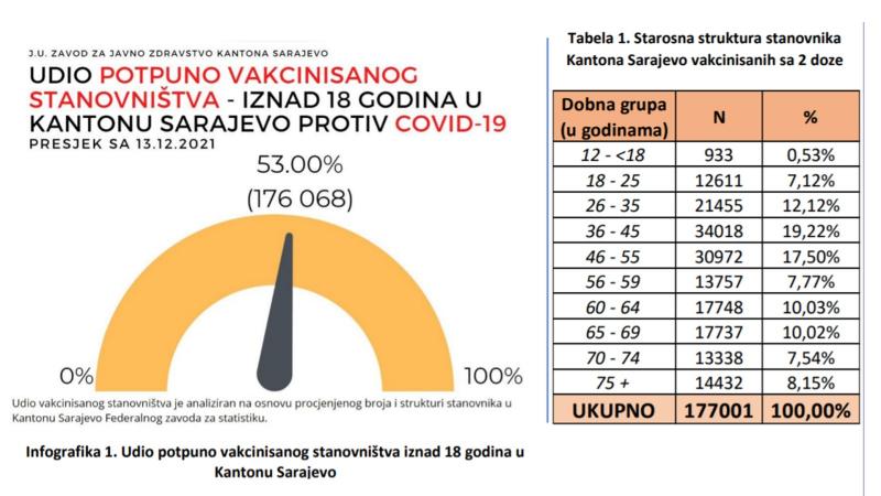 Prema Biltenu vakcinacije Zavoda za javno zdravstvo Kantona Sarajevo, do danas je u potpunosti vakcinisano ukupno 177.001 stanovnik našeg kantona. Od toga 176.068 osoba su dobi iznad 18 godina, što predstavlja 53 posto punoljetnog stanovništva našeg kantona.