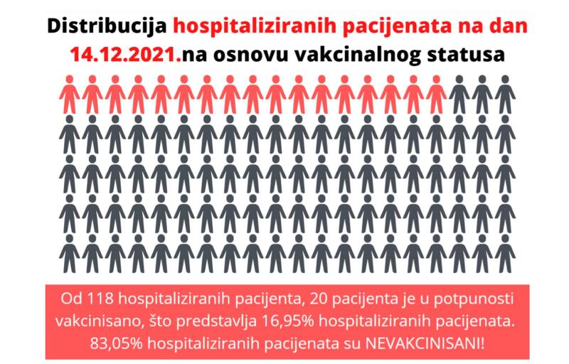 Prema posljednjim podacima iz Zavoda za javno zdravstvo KS, na bolničkom liječenju od COVID-19 oboljenja nalazi 118 pacijenata. Od ovog broja, njih 20 je u potpunosti vakcinisano, što predstavlja 16,95 posto hospitaliziranih, dok je 83,05 posto osoba na bolničkom liječenju nevakcinisano.