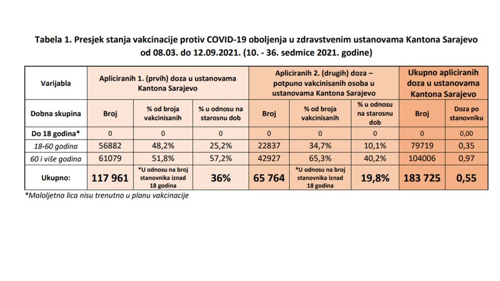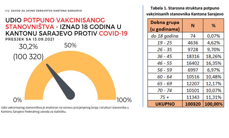 Prema podacima Zavoda za javno zdravstvo Kantona Sarajevo, do sada je u potpunosti vakcinisano ukupno 100.320 stanovnika KS, što predstavlja 30,2 posto stanovništva starijeg od 18 godina.