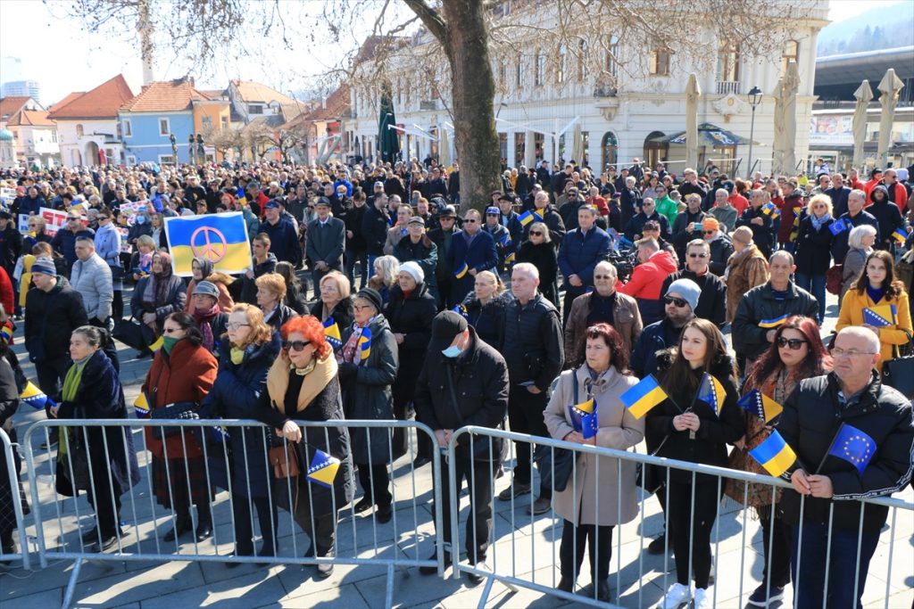 U organizaciji Grada Tuzla, Foruma građana Tuzla i Memorijalnog centra Srebrenica – Potočari, na Trgu slobode u Tuzli, pred nekoliko hiljada građana i građanki, održan je skup podrške Ukrajini te miru u Evropi i Bosni i Hercegovini.